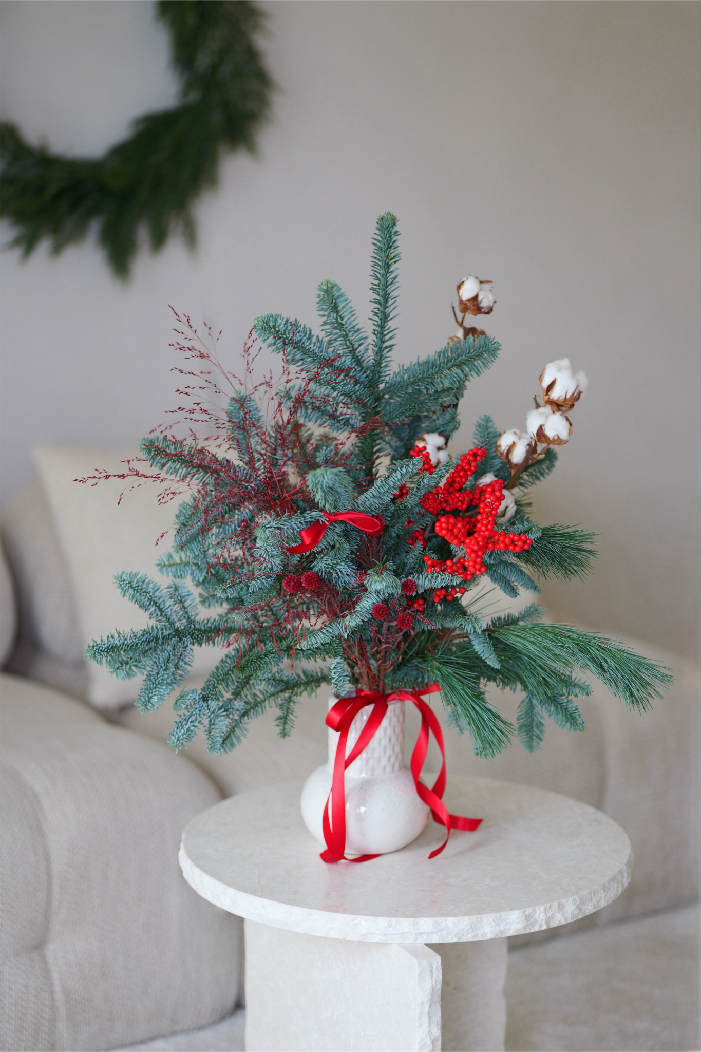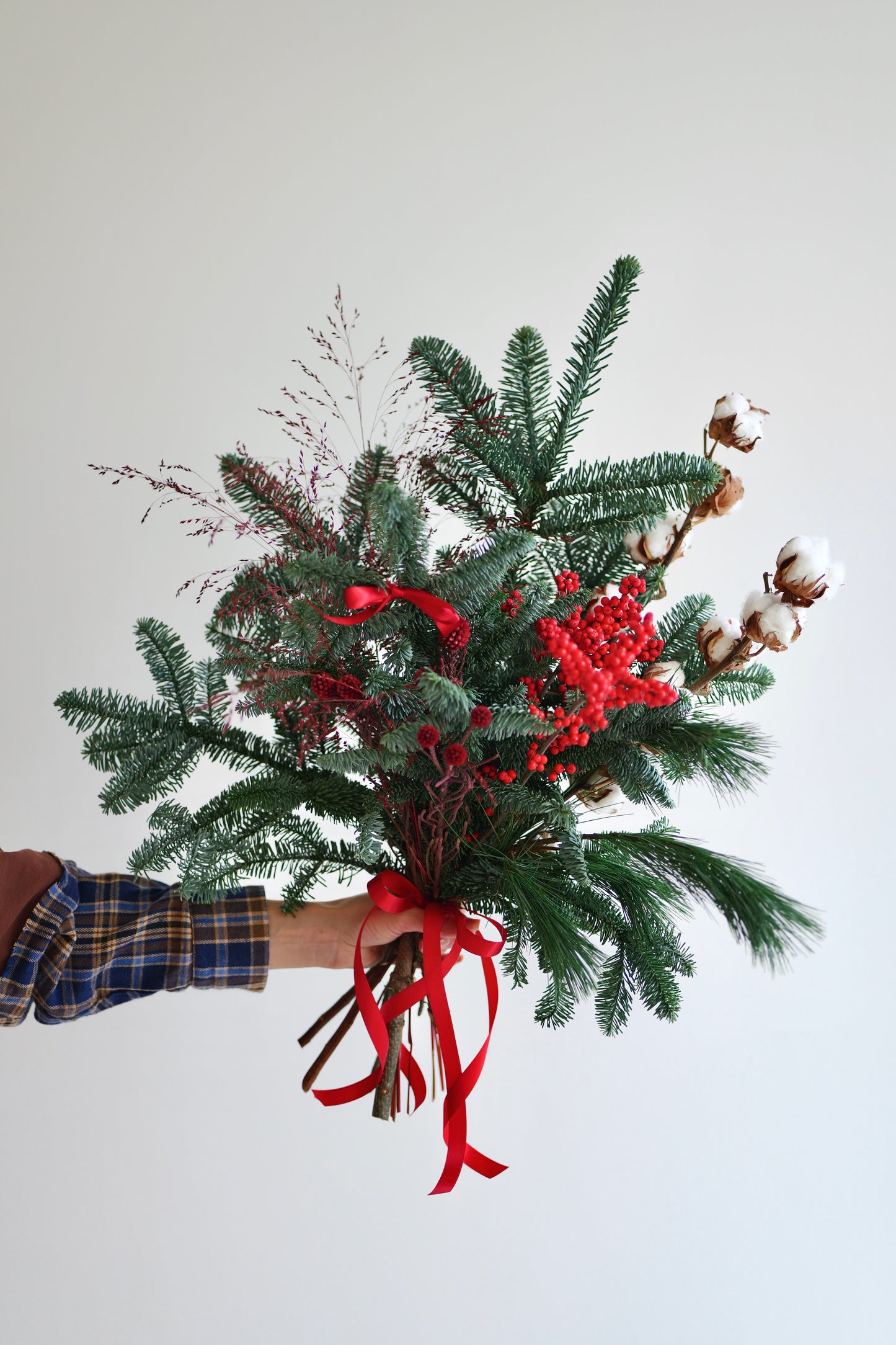 Zimní svazek jehličí s bavlnou a zimními větvičkami